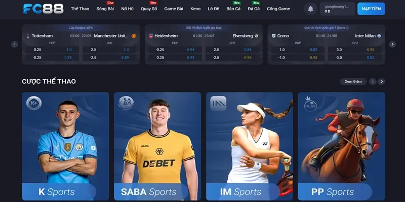 Thể thao FC88 chính là địa chỉ cá độ thể thao trực tuyến uy tín số 1 tại Việt Nam. Đây chính là địa chỉ trang web chuyên cung cấp và lên kèo cược của đa dạng giải đấu với nhiều bộ môn như: Bóng đá, cầu lông, bóng chuyền, quần vợt, e-sports,… Có đến hàng nghìn trận đấu đang được hệ thống cập nhật và lên kèo mỗi ngày để đáp ứng nhu cầu của người hâm mộ trên toàn cầu.